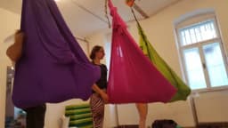 Aerial Yoga Klassen und Trainings in Wien, die du online buchen und mit deinen Freund:innen besuchen kannst. Es gibt alle Levels - von Anfänger bis zu Fortgeschritten.