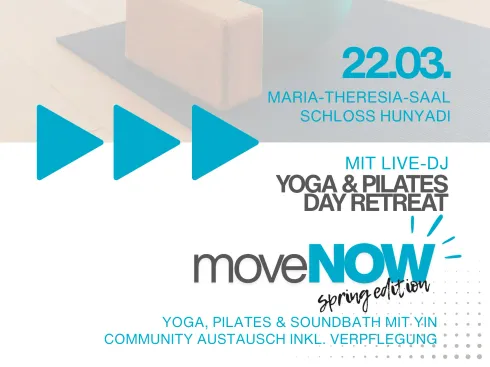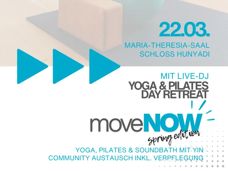 Erlebe einen besonderen Tag voller Bewegung, Energie und Community in der einzigartigen Atmosphäre des Maria-Theresia-Saals im Schloss Hunyadi. move NOW – Spring Edition verbindet Flow Yoga, eine energiegeladene Pilates Party mit Live-DJ und ein tief entspannendes Soundbath mit Yin Yoga zu einem ganzheitlichen Day Retreat.