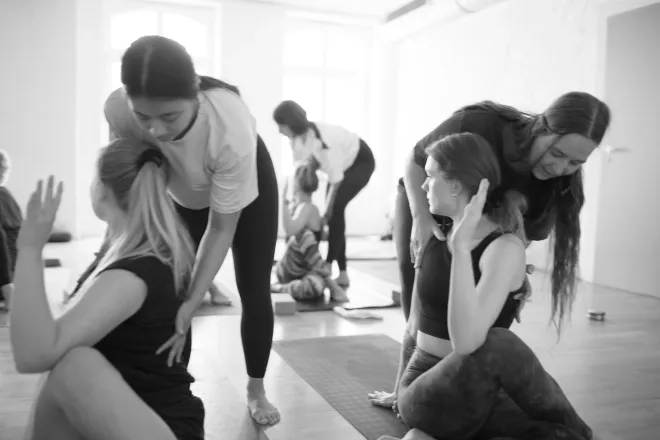 Jule begann 2018 bei Three Boons Yoga zu praktizieren, auf der Suche nach der Balance zwischen dem Großstadtleben, der Arbeit in Kunst und Kultur und der Sehnsucht nach innerer Ruhe und Frieden. Die Kraft und Energie, die durch das gemeinsame Praktizieren entstehen und die tiefergehende Begegnung mit sich selbst und anderen haben sie fasziniert und inspiriert. 2023 absolvierte Jule das 200h Yoga Teacher Training und startete in diesem Sommer das 630+h Mentorship mit ihrer Lehrerin Hilli. Om Asato Ma Sat Gamaya Jule started her practice at Three Boons Yoga in 2018, looking for a balance between big city life, working in art and culture, and the longing for inner peace and quiet. The strength and energy that come from practicing together and the deeper encounter with the self and others have fascinated and inspired her. In 2023 Jule completed the 200h Yoga Teacher Training and started her mentorship with her teacher Hilli this summer. Om. Lead me from the unreal to the real.